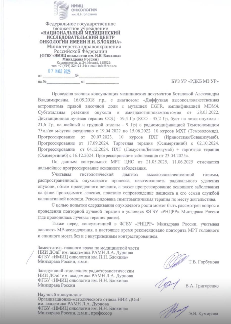 А теперь — она лежит на больничной койке, и врачи говорят, что в мозге снова растёт опухоль…