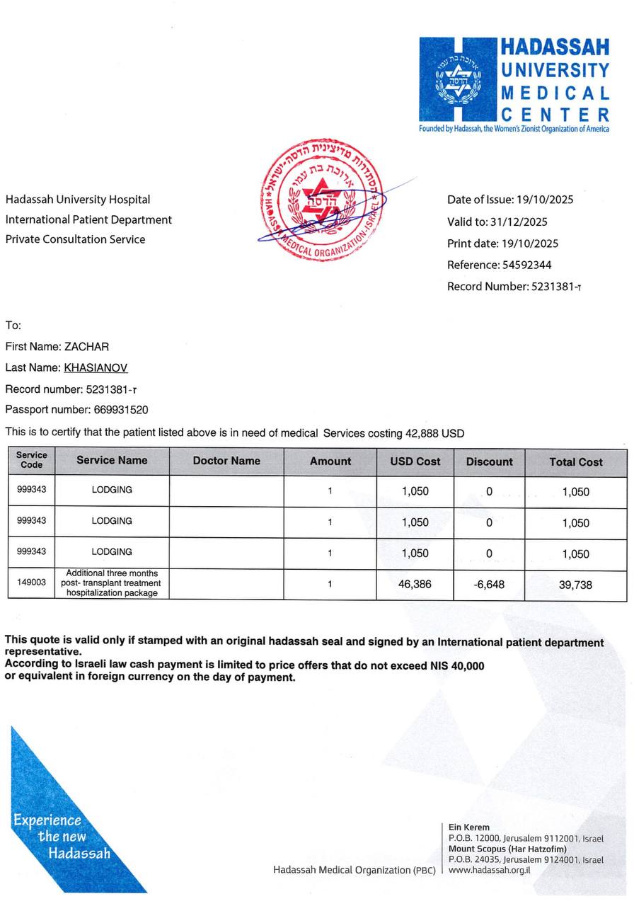 нам необходимо пройти лечение в клинике, которая наблюдает Захара после пересадки.
