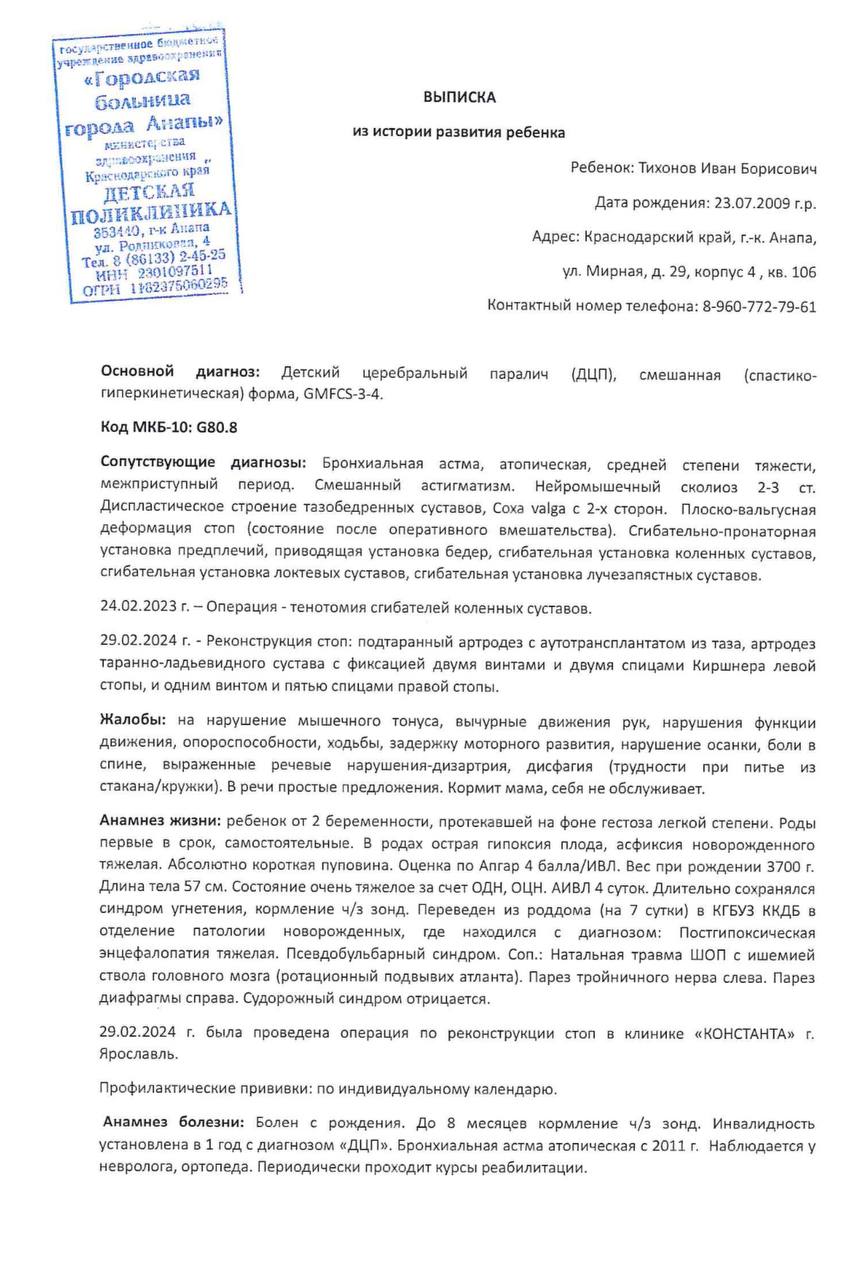 Сейчас Ивану необходим курс реабилитации в клинике «Сакура» 🏥💔. Там умеют работать с подростками, с тяжёлыми формами, там дают не просто упражнения, а возможность двигаться дальше 😢🙏.